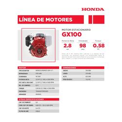 Motor Honda GX 100 KRW Motor de 4 HP, sistema OHV (válvulas a la cabeza) de eje horizontal, con arranque manual. Los profesionales basan la elección de este motor para ofrecer en sus productos un arranque fácil y seguro, y un bajo consumo de combustible. Esto motor ha sido desarrollado por Honda para ser utilizado especialmente en vibro pisones. USO PROFESIONAL El motor estacionario GX100 Monocilíndrico y 4 Tiempos es el complemento para que tus herramientas comiencen a funcionar. Refrigerado por aire y con una Cilindrada 98 cm3 y 2,8 HP de potencia, este motor estacionario es ideal para su uso en vibropisones.